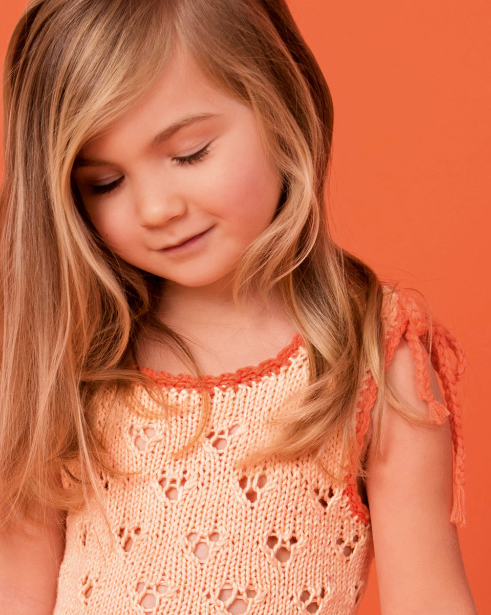 Lana Grossa Soft Cotton (70 % Baumwolle, 30 % Microfaser, Lauflänge 140 m/50 g) 150 (150- 200) g Apricot (Fb 1) und 50 g Koralle (Fb 12); Stricknadeln Nr. 3,5, eine 40 cm lange Rundstricknadel Nr. 3,5, Häkelnadel Nr. 3.