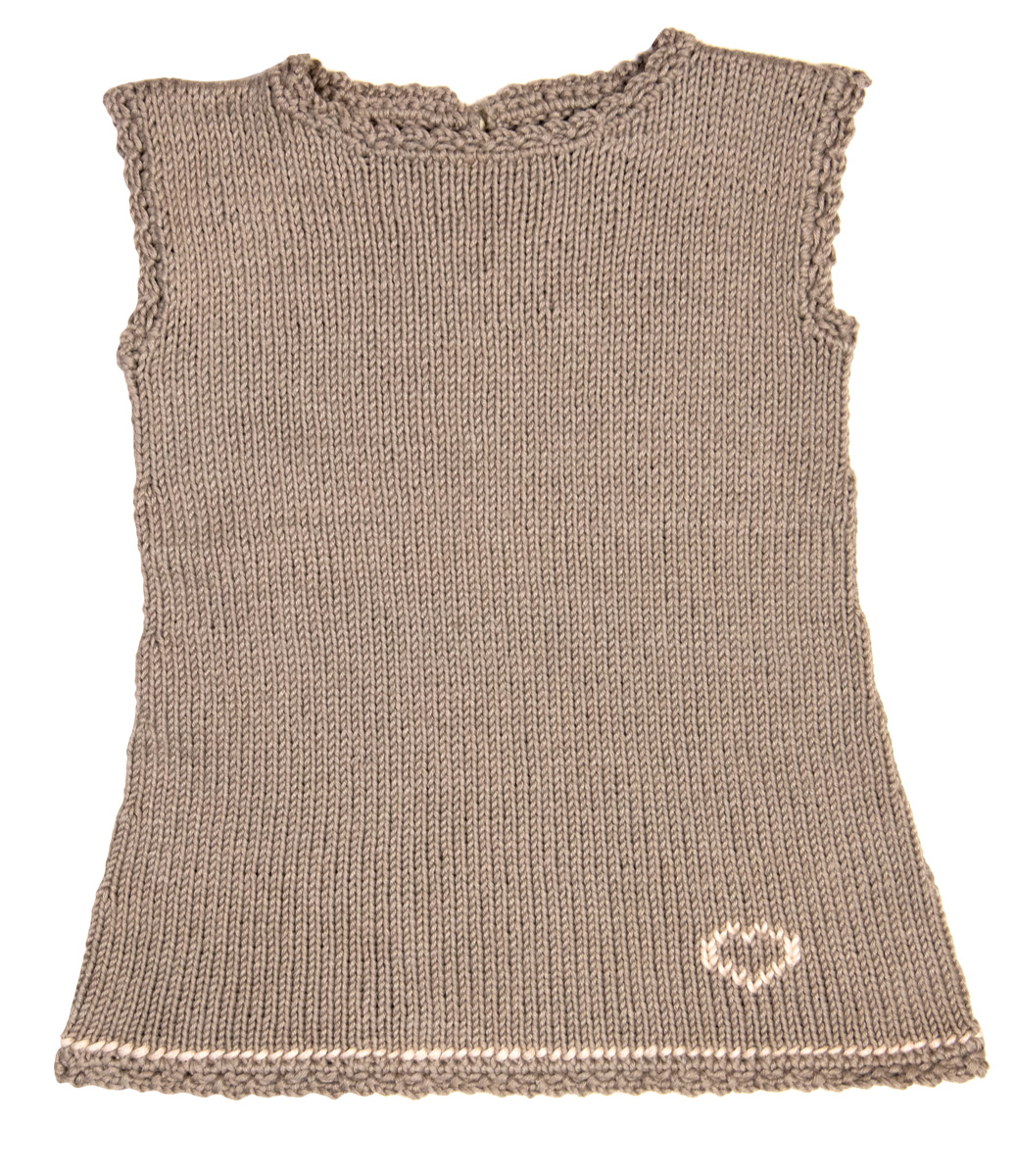 Lana Grossa Soft Cotton (70 % Baumwolle, 30 % Polyacryl, Lauflänge 140 m/50 g) 100 (150/150) g Graubeige (Fb 4) und 50 g Beige (Fb 3); Stricknadeln Nr. 3,5, Häkelnadel Nr. 3; ein Knopf mit 11 mm Ø.