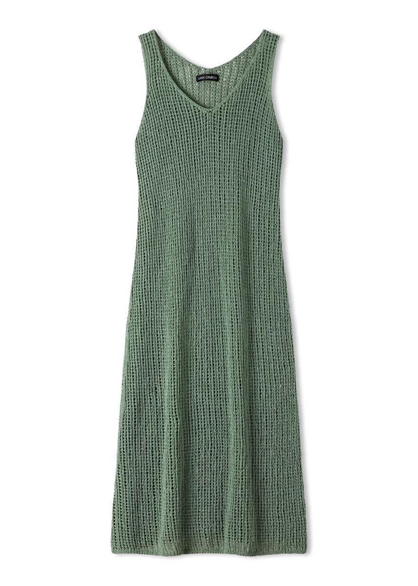 Umschläge und zusammengestrickte Maschen machen dieses Kleid luftig-leicht und halbtransparent. Wir tragen das taillierte, leicht ausgestellte Piece über Bikinis oder Badeanzüge.