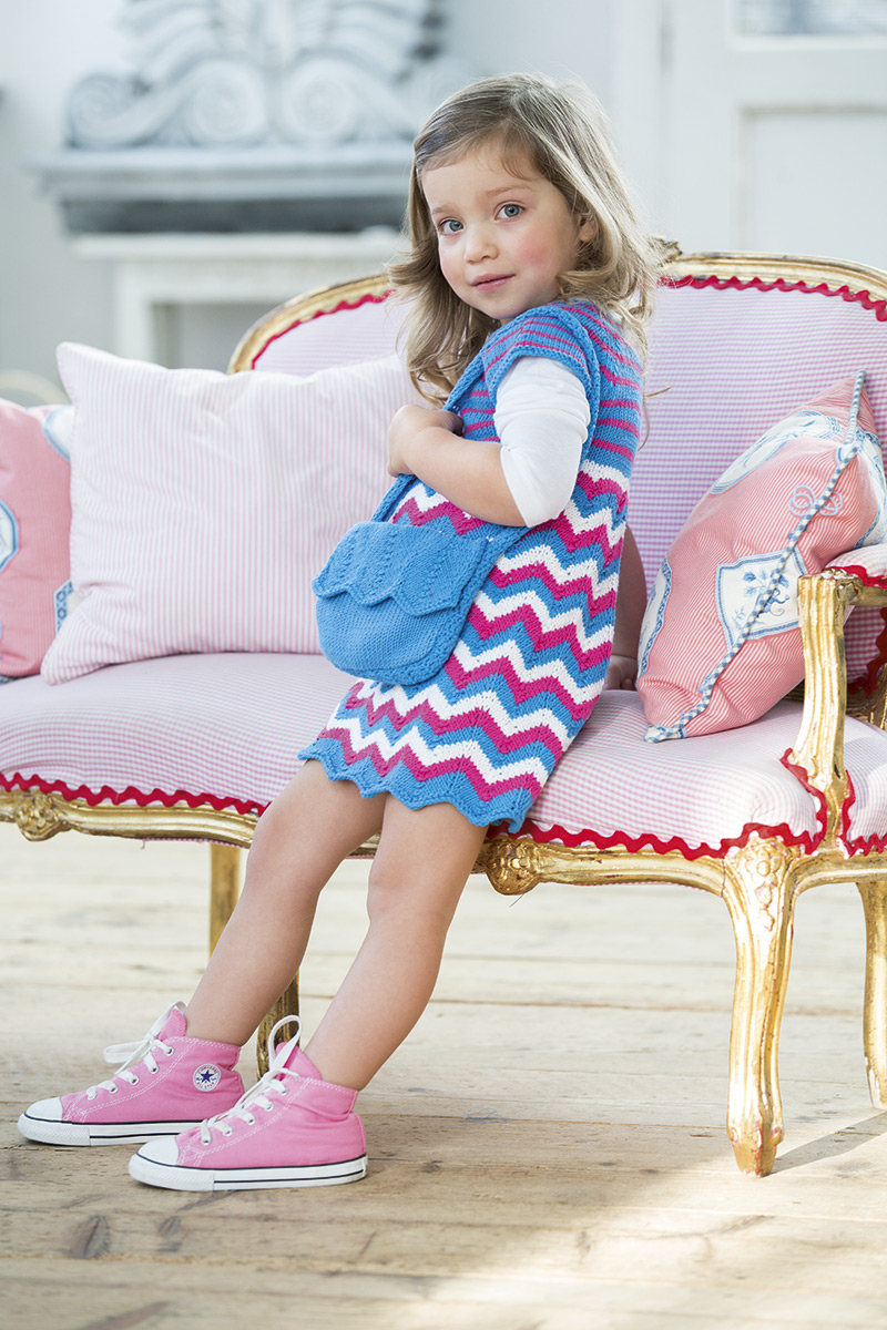 Lana Grossa Qualität „Elastico“, 96 % Baumwolle, 4 % Polyester, Lauflänge 160 m/50 g; ca. 100 g Azurblau (Fb 115) und je 50 g Weiß (Fb 1) und Pink (Fb 100); eine ca. 40 cm lange Rundstricknadel Nr. 4, eine Häkelnadel Nr.3,5.
