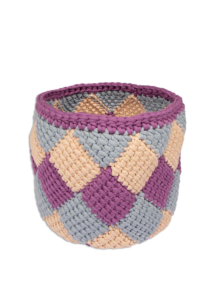 Größe: Umfang ca. 76 cm, Boden nach 1. Rd in Viola ø ca. 25 cm, ab Rautenmitte der 1. beigen Rd 21 cm hoch