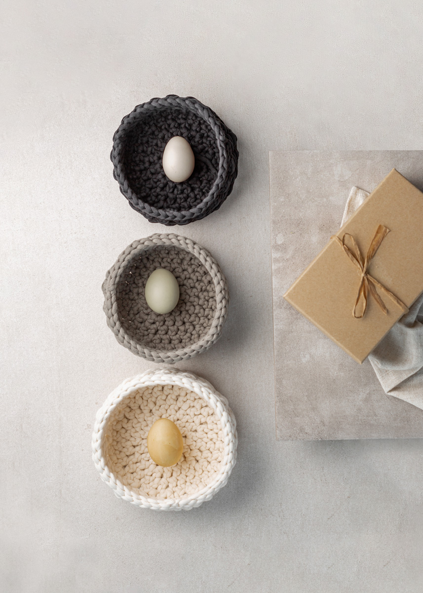Lana Grossa-Qualität „The Tube“ (60 % Baumwolle, 40 % Nylon, LL = ca. 114 m/200 g): ca. 100 g in Creme (Fb. 2), Khaki (Fb. 13) oder Schwarz (Fb. 16); 1 Häkelnadel Nr. 7; Wollnadel; Sprühstärke oder Textilverstärker