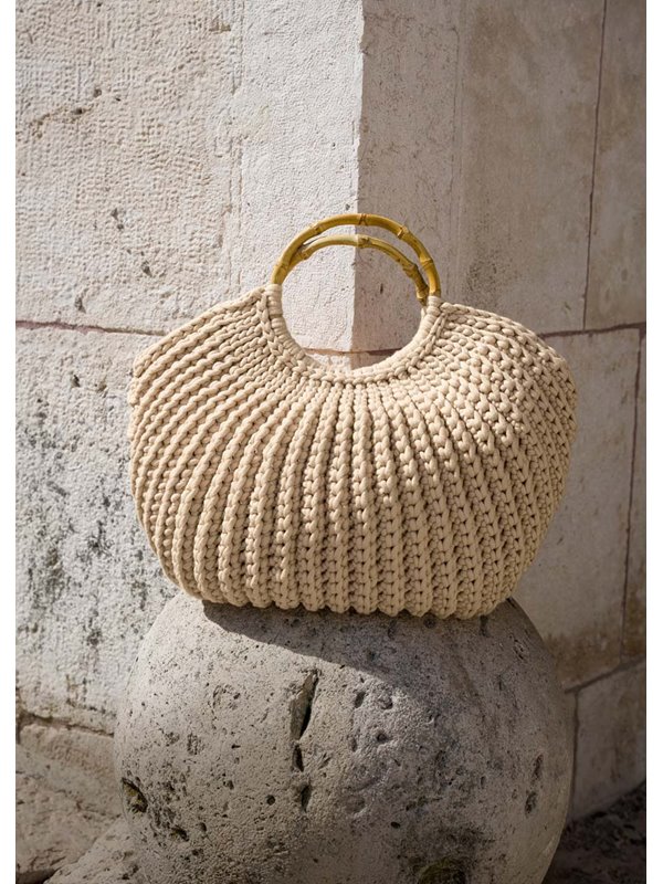 Lana Grossa The Tube (60 % Baumwolle, 40 % Nylon, Lauflänge 114 m/200 g), 600 g Beige (Fb 17); Häkelnadel Nr 9; 2 Bambus Taschengriffe, Durchmesser ca. 14 cm