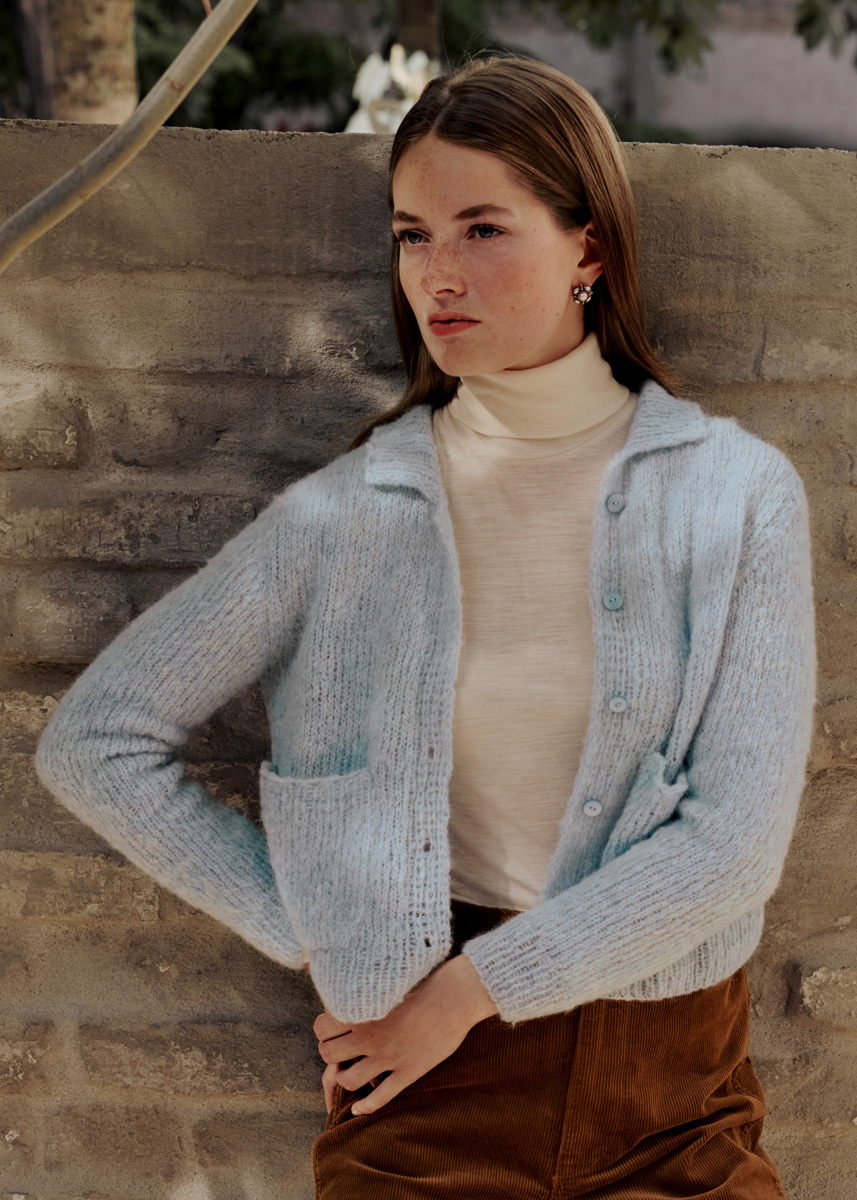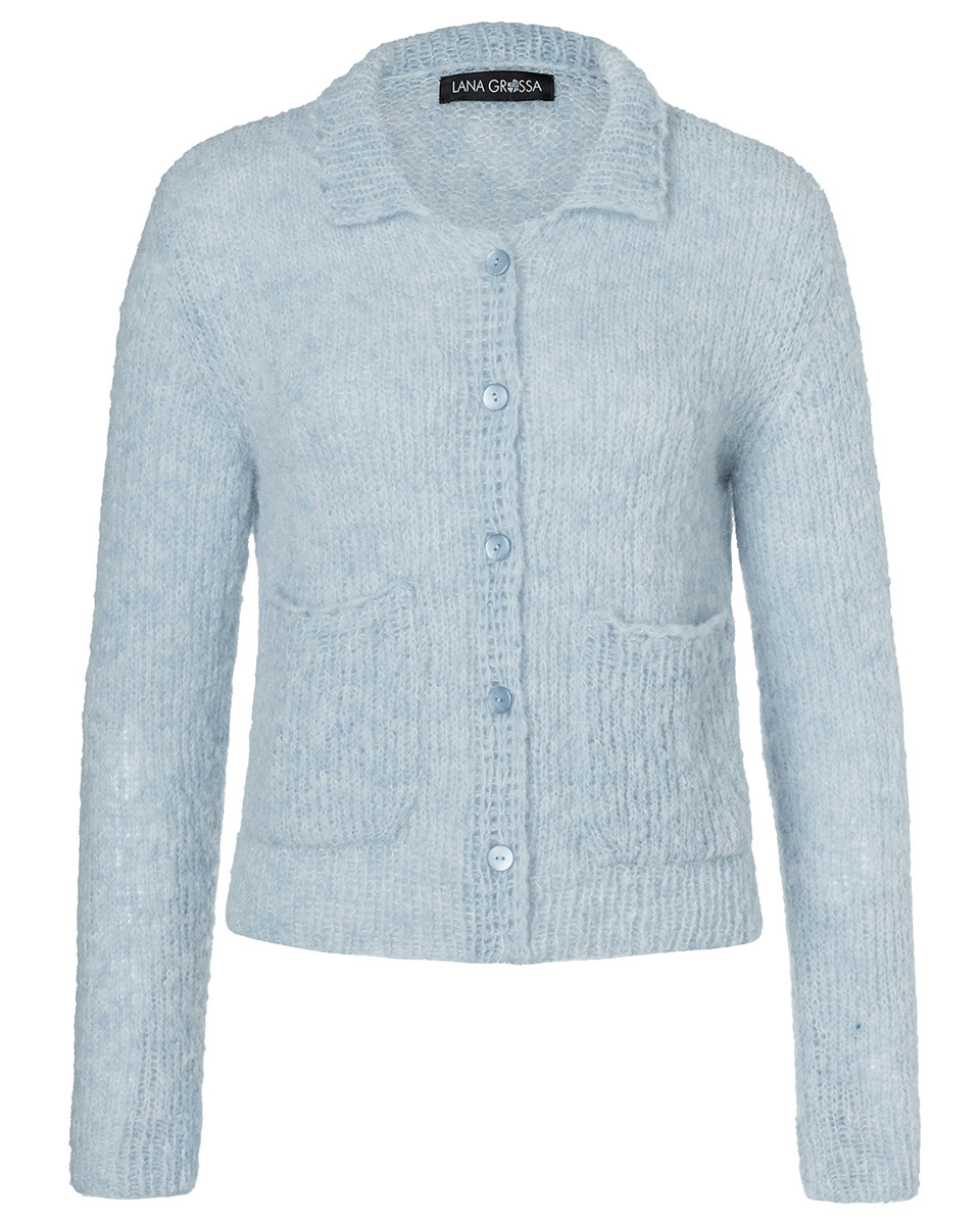 Fein gemacht: Der pastellblaue Kurz- Cardigan wird glatt rechts gestrickt. Luftmaschenbögen an Kragenund Taschenrändern betonen seinen zarten Prinzessinnen-Look.