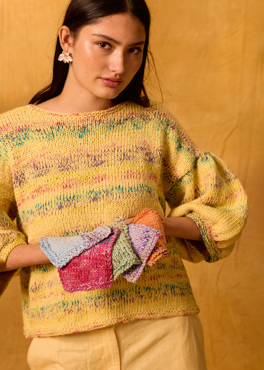 Lana Grossa-Qualität „Gomitolo California“ (66 % Baumwolle, 30 % Hanf, 4 % Leinen, LL = ca 300 m/100 g): ca 3 (3 - 4 - 4) Knäuel = ca 300 (300 - 400 - 400) g Vanille/ Fuchsia/Pistazie/Blauviolett/Petrolblau/Altrosa (Fb 3043); Lana Grossa-Qualität „Cotonella“ (100% Baumwolle (Pima), LL = ca 140 m/50 g): ca 6 (6 - 7 - 8) Knäuel = ca 300 (300 - 350 - 400) g Gelb (Fb 205); kurze und längere Rundstricknadel Nr 4 und 5; Nadelspiel Nr 4.