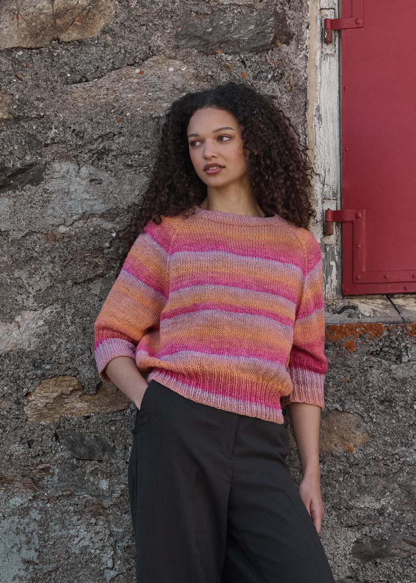 Der Pullover wird von oben nach unten in einem Stück gestrickt.