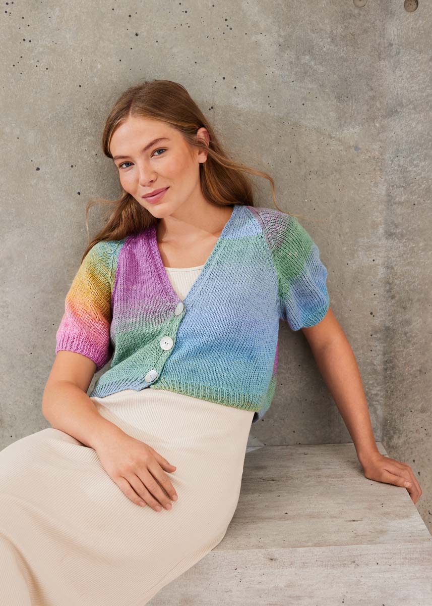 Lana Grossa-Qualität „Cotonella“ (100 % Baumwolle (Pima), LL = ca 280 m/100 g): ca 300 (300 - 300 - 400) g Himmelblau/ Salbeigrün/Violett/Ockergelb/Nelkenrosa/Pink (Fb 12); Stricknadeln Nr 4 und Nr 5; 3 Perlmutt-Knöpfe Fb 12, Durchmesser ca 25 mm, Artikel-Nr 37604 von Union Knopf.