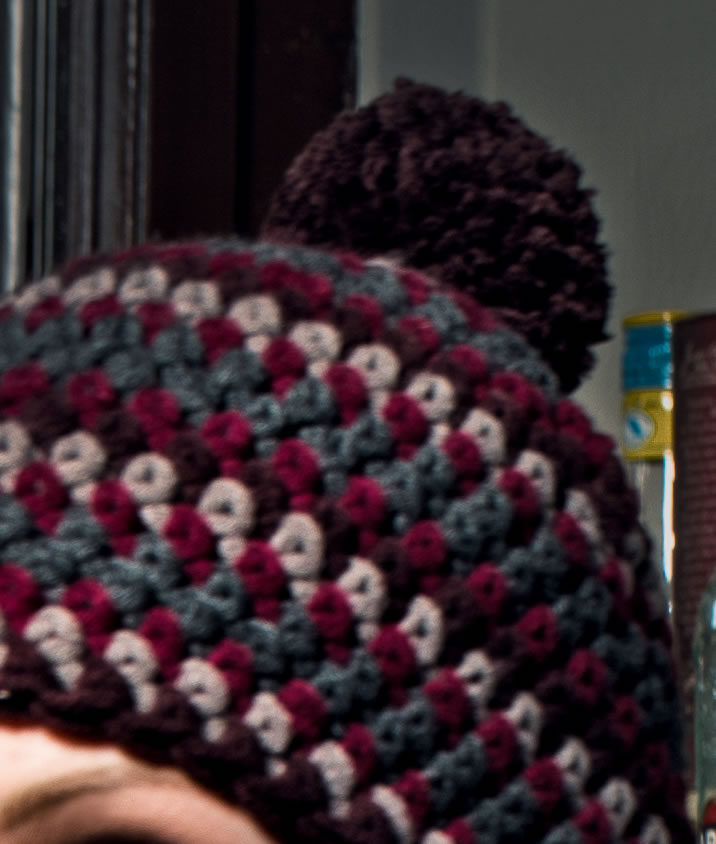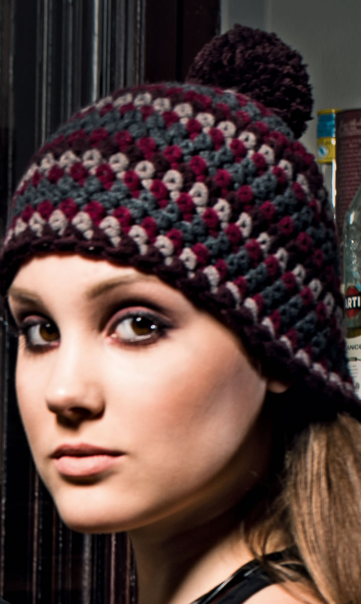Lana Grossa-Qualität „Mille II” (50 % Schurwolle (Merino extrafine), 50 % Polyacryl, waschmaschinenfest, LL = ca. 55 m/50 g): je ca. 50 g oder Reste in Brombeer (Fb. 73), Taupe (Fb. 52), Burgund (Fb. 72) und Anthrazit (Fb. 68); 1 Wollhäkelnadel Nr. 8; evtl. 1 Pompon-Set von Lana Grossa.