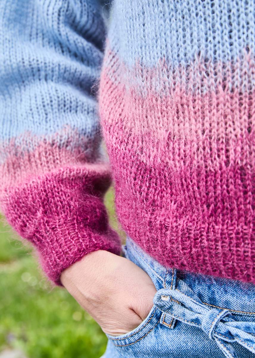 Lana Grossa-Qualität „Landlust- Kidmohair“ (70% Mohair Superkid, 30% Baumwolle, LL ca. 225 m/25 g), 125 (150 - 150 - 175) g in Hellblau (Fb 7), 50 (50 - 75 - 75) g in Brombeer (Fb 14) und 25 (25 - 50 - 50) g in Mauve (Fb 15); Stricknadeln Nr. 5 und Nr. 6, 1 Rundstricknadel Nr. 5, 40 cm lang.