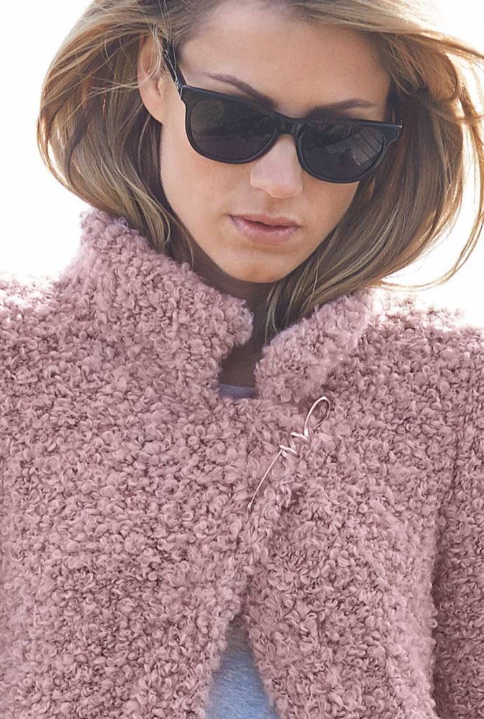 Dieser Bouclé-Mantel ist ein echter Statement- Solist! Für den cleanen Look sorgt der Stehkragen.Ein femininer Roséton verleiht diesem Keypiece das elegante Finish.