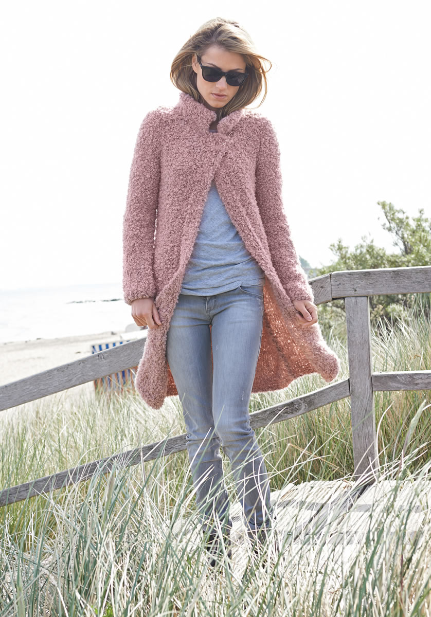 Lana Grossa-Qualität „Bombolo” (40 % Polyacryl, 30 % Mohair, 20 % Schurwolle (Merino), 10 % Polyamid, LL = ca. 65 m/50 g): ca. 700 (750) g Altrosa (Fb. 9); Stricknadeln Nr. 5,5, 1 Rundstricknadel Nr. 5, 60 cm lang; 1 Schmucknadel von Union Knopf, Art. 59401, 95 mm lang, Fb. 82 silbern.