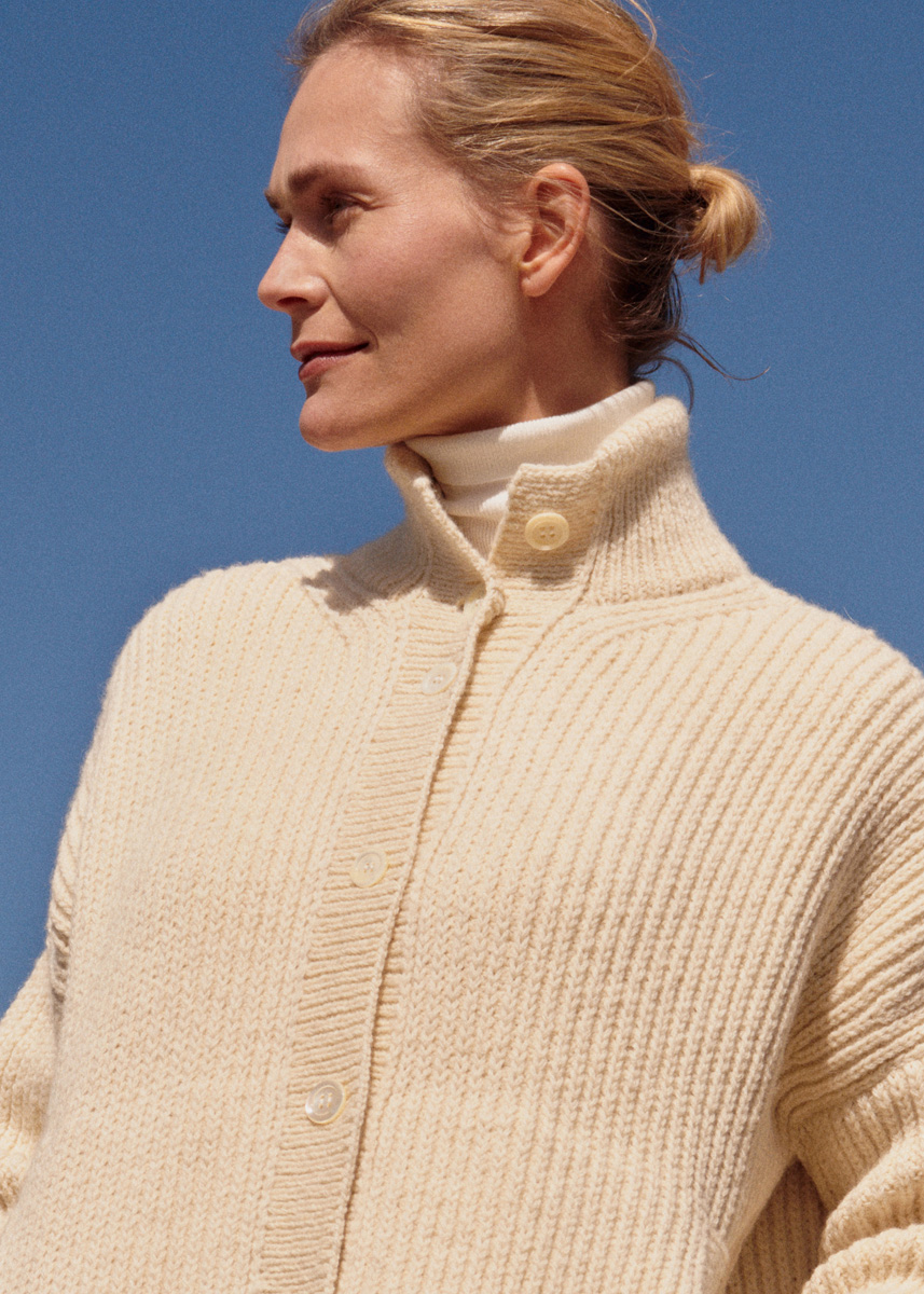 Traumteil gefällig? Hier eine Jacke, die super aussieht und, dank Kettengarn mit viel Alpaka, unglaublich wärmt. Die angesagte Bomberjacken-Form entsteht allein durch den Wechsel von klassischen Rippen (Bündchen) ins Patentmuster. Schöne Details: der hohe, gedoppelte Schmeichelkragen und die stilechten Eingrifftaschen.