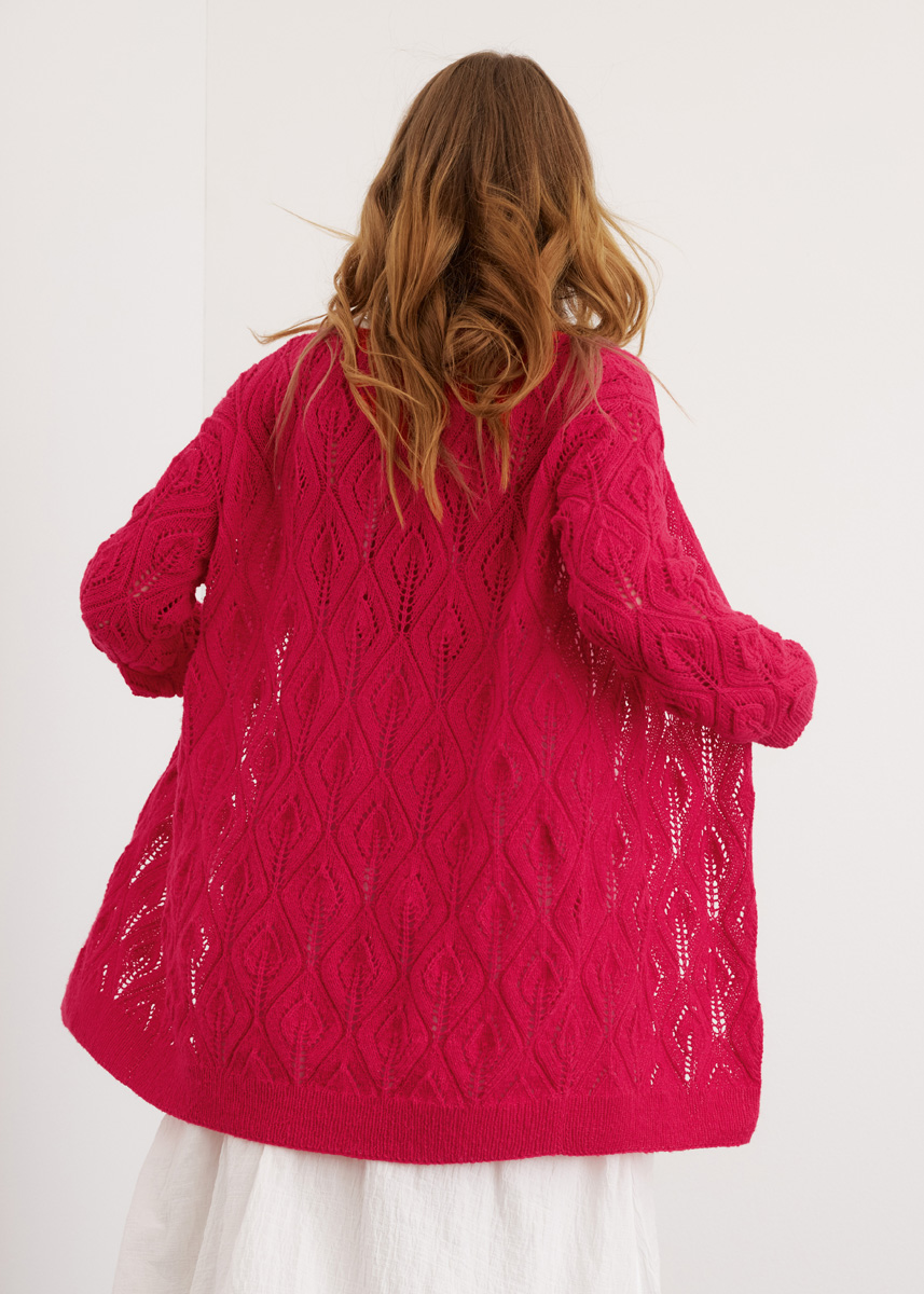 Beim himbeerroten Cardigan wird das Blatt-Ajourmuster durch ein neues, voluminöses Schlauchgarn hervorgehoben. Der Merino-Anteil macht den Cardigan zum Ganzjahresmodell. Dazu passt das Top von Seite 56.