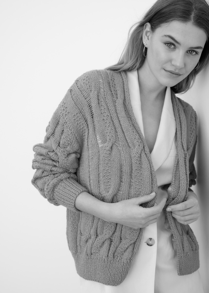 Dieser Cardigan hat eine gerade Form mit rund eingesetzten Ärmeln. Sein markantes Muster besteht aus Zöpfen und Fallmaschen. das doppelfädig verstrickte Schlauchgarn (neu) betont den plastischen Look des Modells.