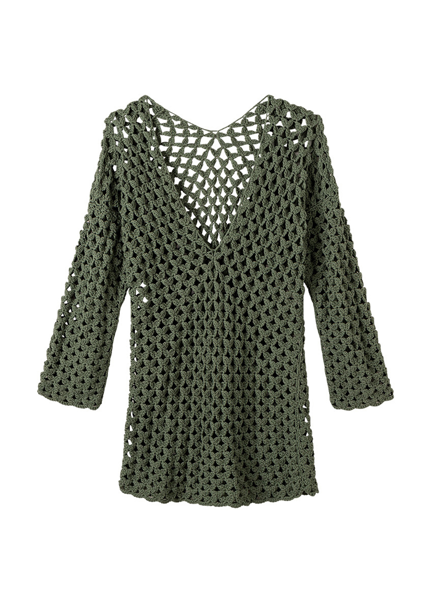 Lana Grossa-Qualität „Promessa” (70 % (Bio) Baumwolle, 30 % Rec. Polyamid, LL = ca. 125 m/50 g): ca. 600 g Lodengrün (Fb. 17); 1 Wollhäkelnadel Nr. 4,5.