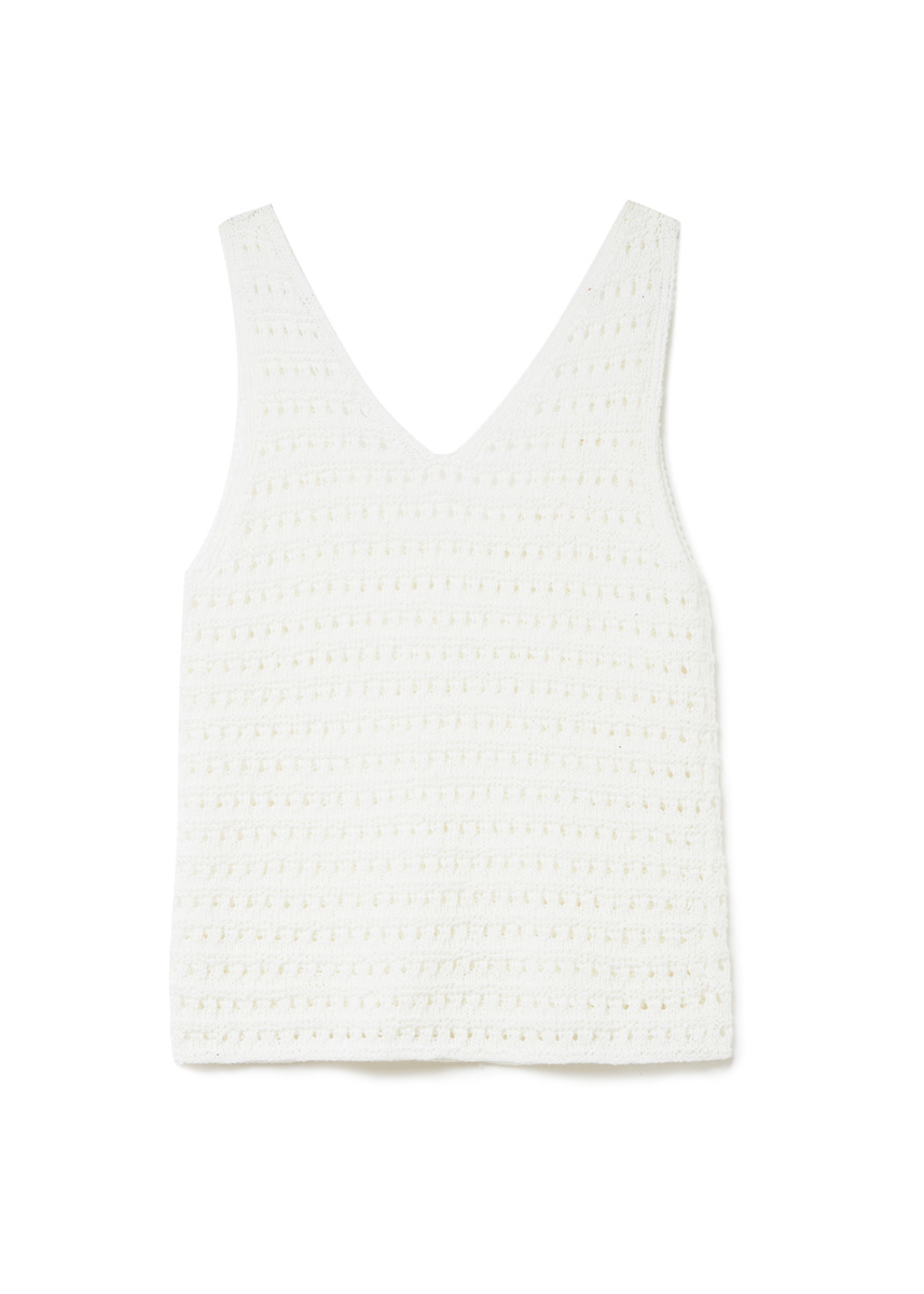 Knipst die Sonne an und funktioniert auch bei Nacht: Schmales, luftig gemustertes Top (kraus rechts/Lochmusterreihen) aus einem Leinengemisch in strahlendem Weiß. Mit dem Cardigan von Seite 18/19 avanciert es zum spektakulären Twin-Set.