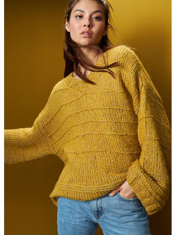 Bunte, winzige Noppen, kraus gestrickte Reihen und ein kleiner V-Neck mit breiter Blende: Mehr braucht es nicht, um einen lässigen Sweater zum Trend-Teil zu machen.