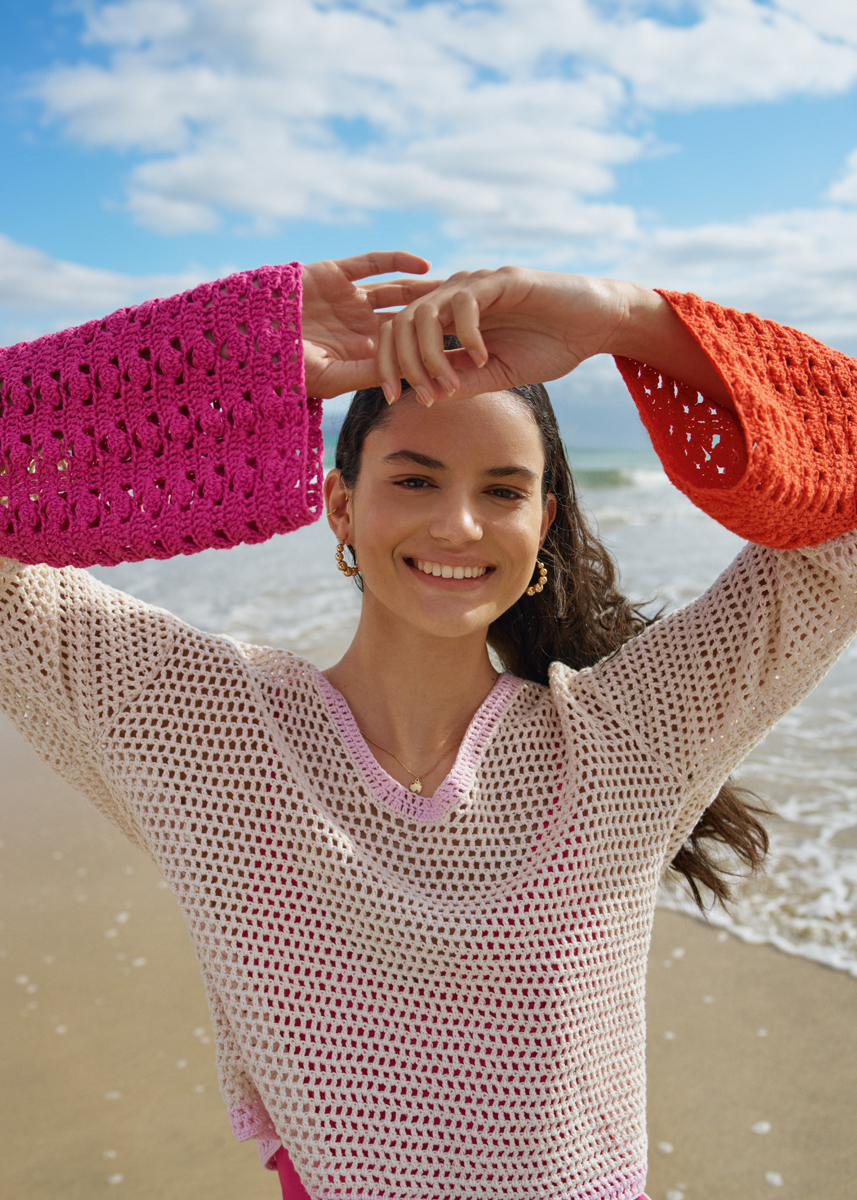 Lana Grossa-Qualität „Campo” (65 % Baumwolle, 25 % Viskose, 10 % Leinen, LL = ca. 165 m/50 g): ca. 250 g Creme (Fb. 2) und je ca. 50 g Leuchtendrot (Fb. 16), Pink (Fb. 18) und Rosé (Fb. 21); 1 Wollhäkelnadel Nr. 3,5.
