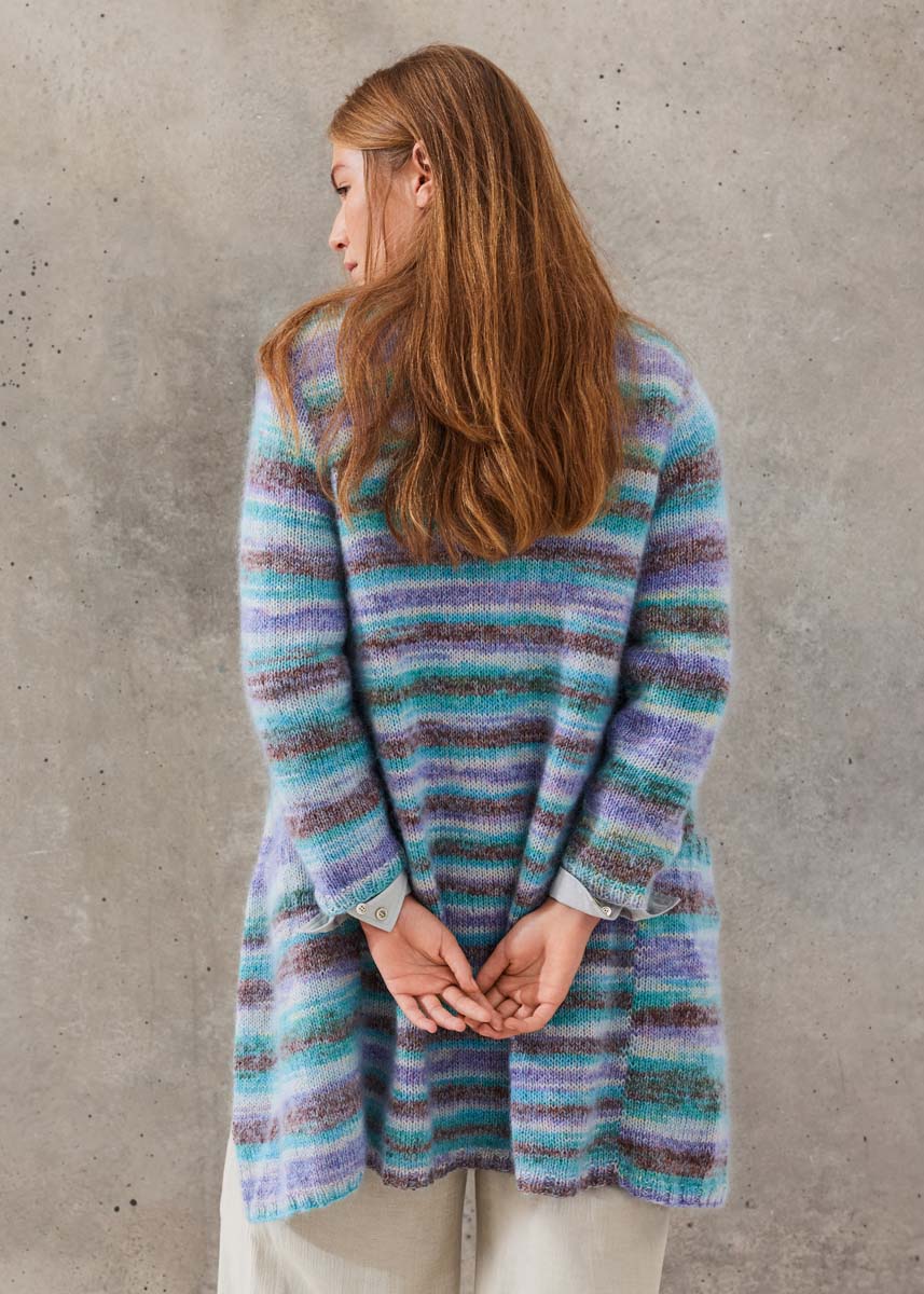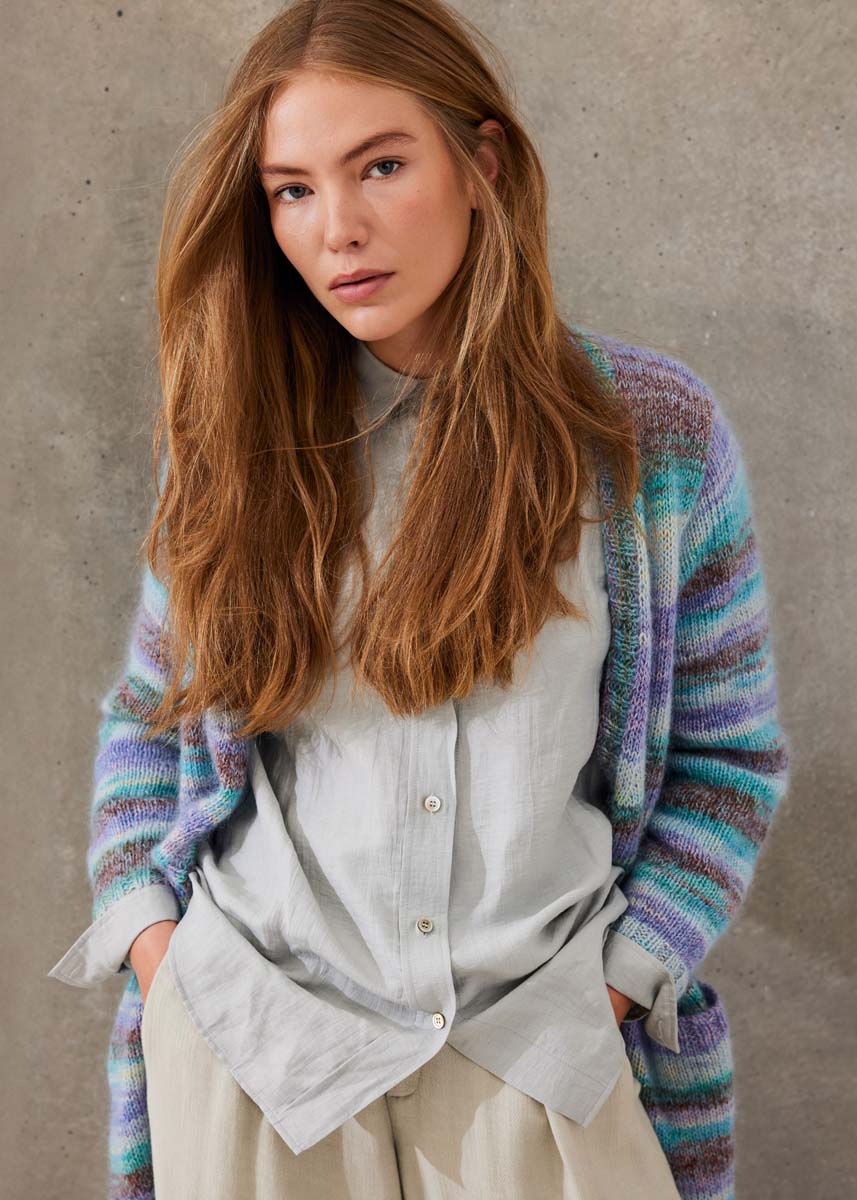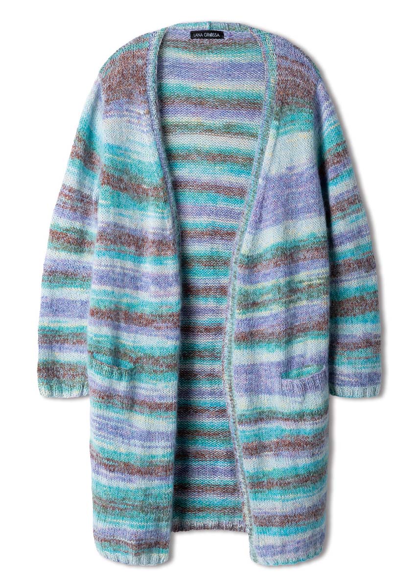 Lana Grossa-Qualität „Gianna“ (80 % Baumwolle (Bio), 15 % Schurwolle (Merino), 5 % Kaschmir, LL = ca 180 m/50 g): ca 350 (400 - 450 - 500) g Türkis/Braun/Violett/ Rosa/Mint/Rohweiß (Fb 1) und Lana Grossa-Qualität „Silkhair“ (70 % Mohair (Superkid), 30 % Seide, LL = ca 210 m/25 g): ca 150 (175 - 200 - 225) g Zartblau (Fb 201); Stricknadeln Nr 4 und 4,5.