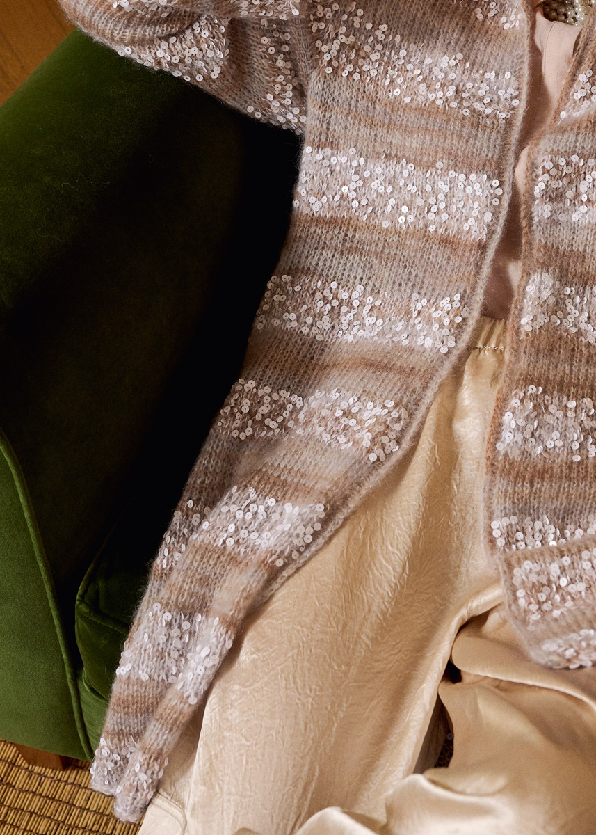 Lana Grossa-Qualität „Superkid Seta“ (65 % Mohair (Superkid), 35 % Seide, LL = ca 100 m/25 g): ca 225 (250 - 275 - 300) g Creme/Beige/Silbergrau (Fb 101); Lana Grossa-Qualität „Cosmo“ (100 % Baumwolle (plus Pailletten), LL = ca 260 m/100 g): 200 (200 - 300 - 300) g Weiß (Fb 1); kurze und lange Rundstricknadel Nr 4,5 und 5,5; Maschenmarkierer.
