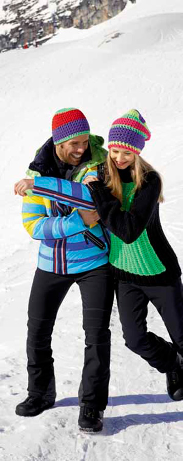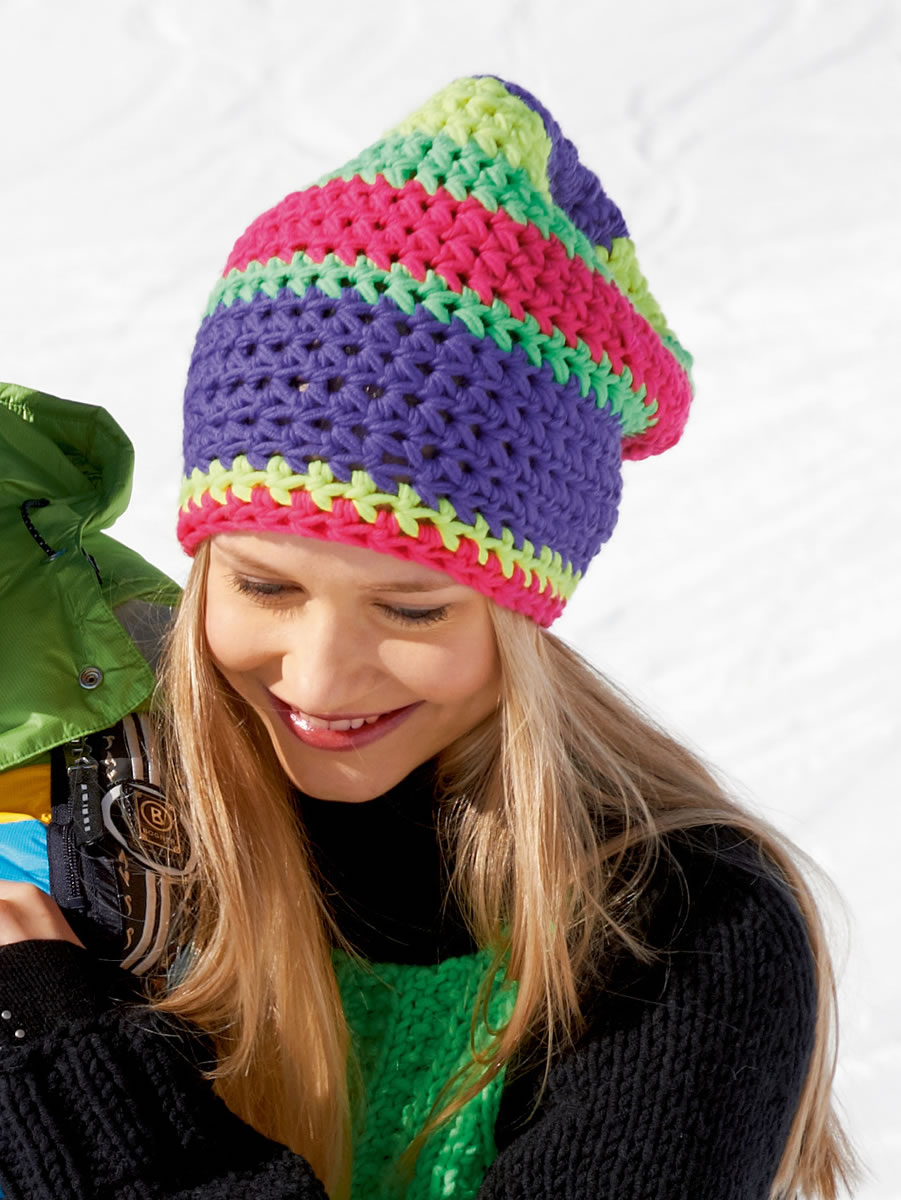 Vor überraschenden Kälteattacken schützen die bunten freestyle gehäkelte Beanies. Wer will nicht auf dem Berg gut aussehen? (Kopfumfang 56 – 58 cm, ca. 28 cm hoch)