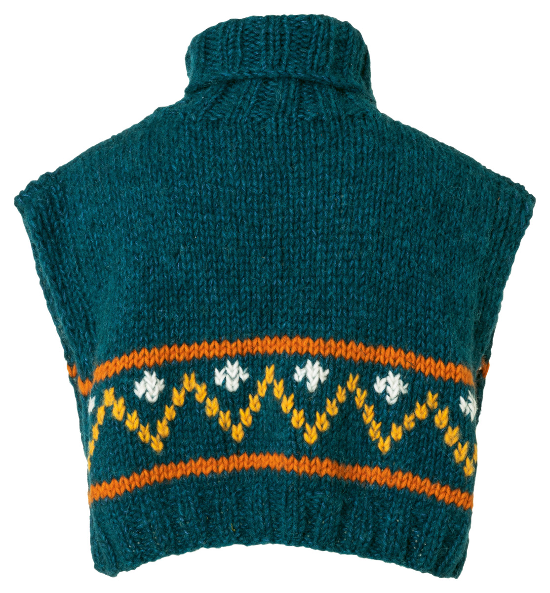 Lana Grossa Qualität „Ecopuno Chunky“ (48% Baumwolle, 33% Schurwolle (Merino extrafine), 19% (Baby) Alpaca, LL = 70 m/50 g): 300 g (400 - 450) Dunkelpetrol (Fb. 122), 50 g Rost (Fb. 115), für Stickerei: 50 g Gelb (Fb. 116), 50 g Rohweiß (Fb. 111), Je eine Stricknadel Nr. 8 und Nr. 9, Rundstricknadel Nr. 8 Seillänge 40-50 cm