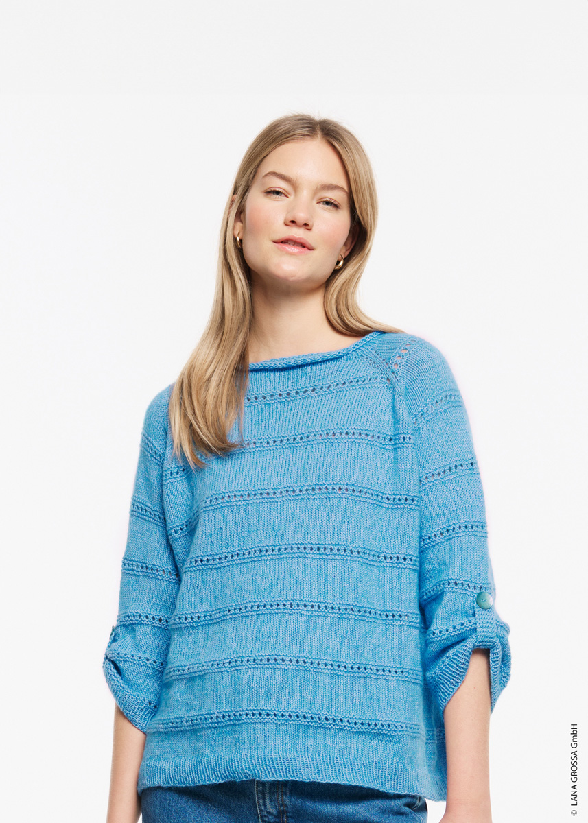 Strickanleitung mit Details wird gedruckt in Form eines Gratisbooklet mitgesendet! GRÖSSE: 32/34 (36/38) 40/42 (44/46) 48/50 (52/54) MATERIAL: Lana Grossa Ecopuno Türkis (Fb. 29)