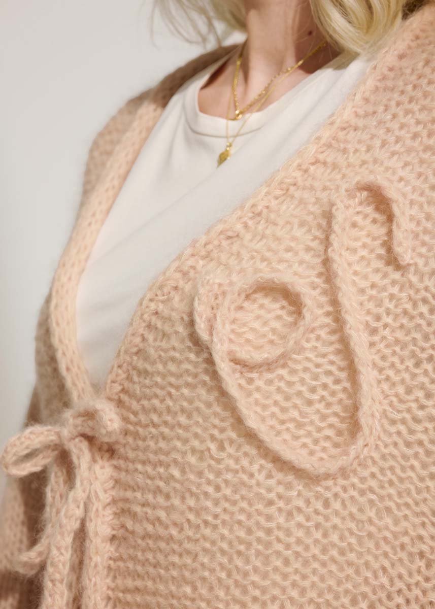 Lana Grossa Soffio 60% Schurwolle (Merino superfine), 30% Baumwolle (Bio), 10% Cashmere: LL = 215 m/25 g (125) 150 (175) g Hellbeige (Fb. 17) und Lana Grossa Silkhair 70% Mohair (Superkid), 30% Seide; LL = 210 m/25 g (75) 75 (100) g Hellbeige (Fb. 18) und (75) 75 (100) g Puderrosa (Fb. 86); eine Rundstricknadel 10 mm, 80 – 100 cm lang, 2 Nadeln eines Nadelspiels für den I-Cord, Häkelnadel 4,5 – 5 mm.