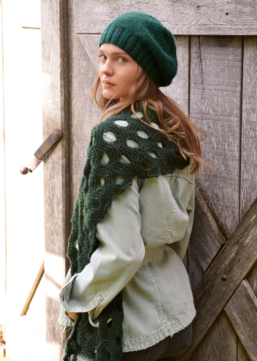 Lana Grossa „Baby Light“ (62% Alpaca (Baby), 23% Schurwolle (Merino), 15% Polyamid; Lauflänge ca. 180 m/50 g), 200 g in Dunkelgrün (Fb 8); Stricknadeln Nr. 7.