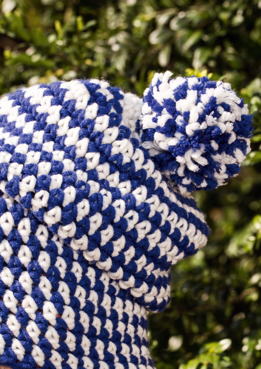 Lana Grossa-Qualität „Mille II” (50 % Schurwolle (Merino extrafine), 50 % Polyacryl, waschmaschinenfest, LL = ca. 55 m/50 g): ca. 100 g Rohweiß (Fb. 17) und ca. 50 g Royal (Fb. 28); 1 Wollhäkelnadel Nr. 8; evtl. 1 Pompon-Set von Lana Grossa.