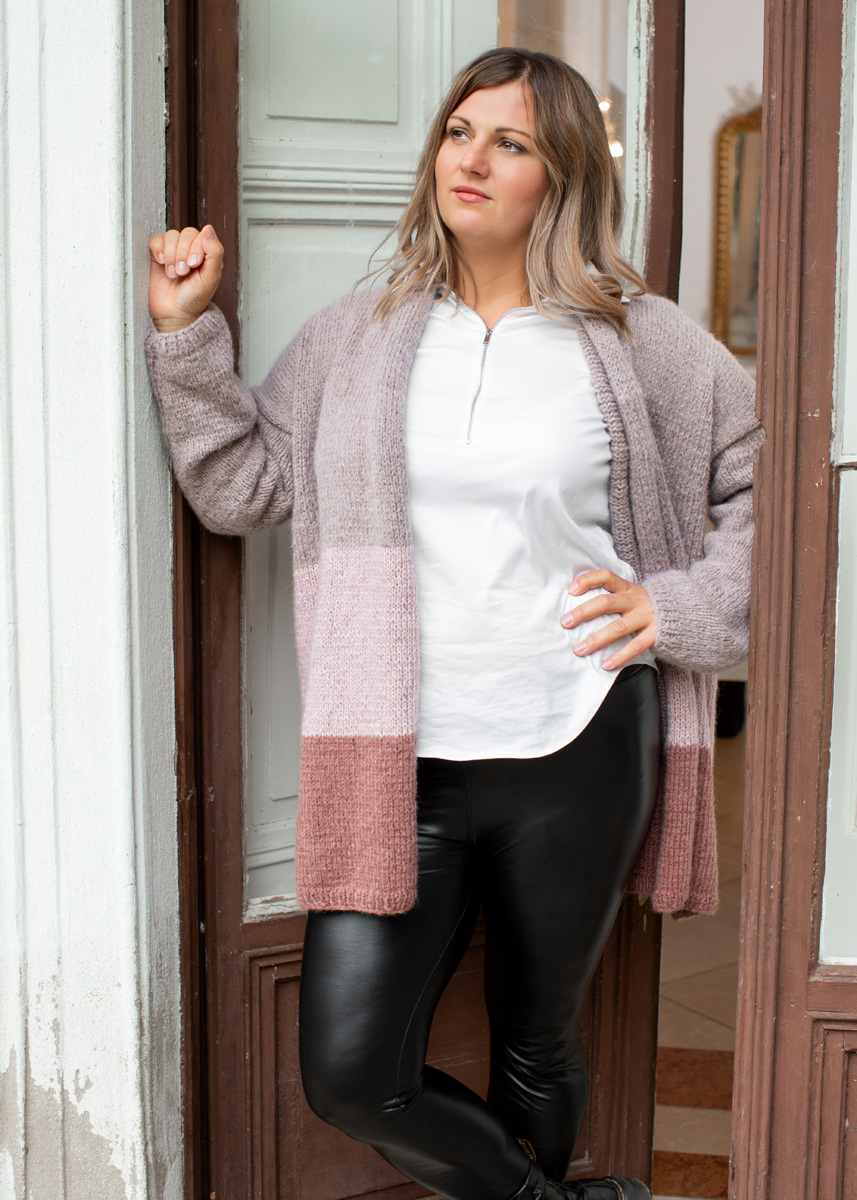 Das Modell hat eine Gesamtlänge von ca. 73 (74 - 75 - 76 - 77 - 78) cm und eine Brustmehrweite von 30 cm bei 80 cm Brustumfang (26 cm bei 88 cm Brustumfang - 22 cm bei 96 cm Brustumfang - 18 cm bei 104 cm Brustumfang - 14 cm bei 116 cm Brustumfang - 10 cm bei 128 cm Brustumfang) mit überlappenden Vorderteilen