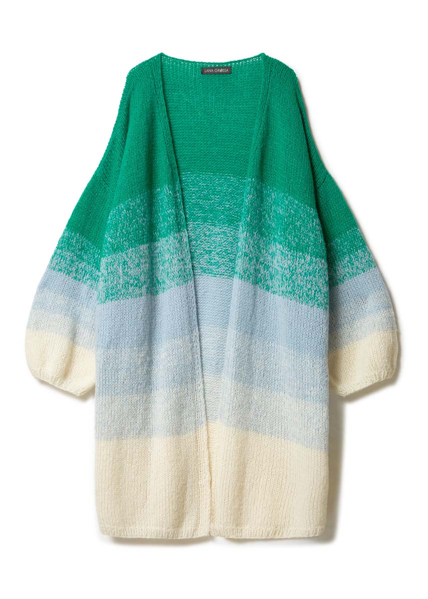 Lana Grossa-Qualität „Soffio” (60 % Schurwolle (Merino superfine), 30 % (Bio) Baumwolle, 10 % Kaschmir, LL = ca. 215 m/25 g): ca. 175 (200) g Rohweiß (Fb. 18), ca. 150 (175) g Grün (Fb. 9) und ca. 150 g Hellblau (Fb. 13); Stricknadeln Nr. 7 und 8. Hinweis: Alles mit dreifachem Faden stricken, und zwar wie in folgenden Streifenfolgen beschrieben!