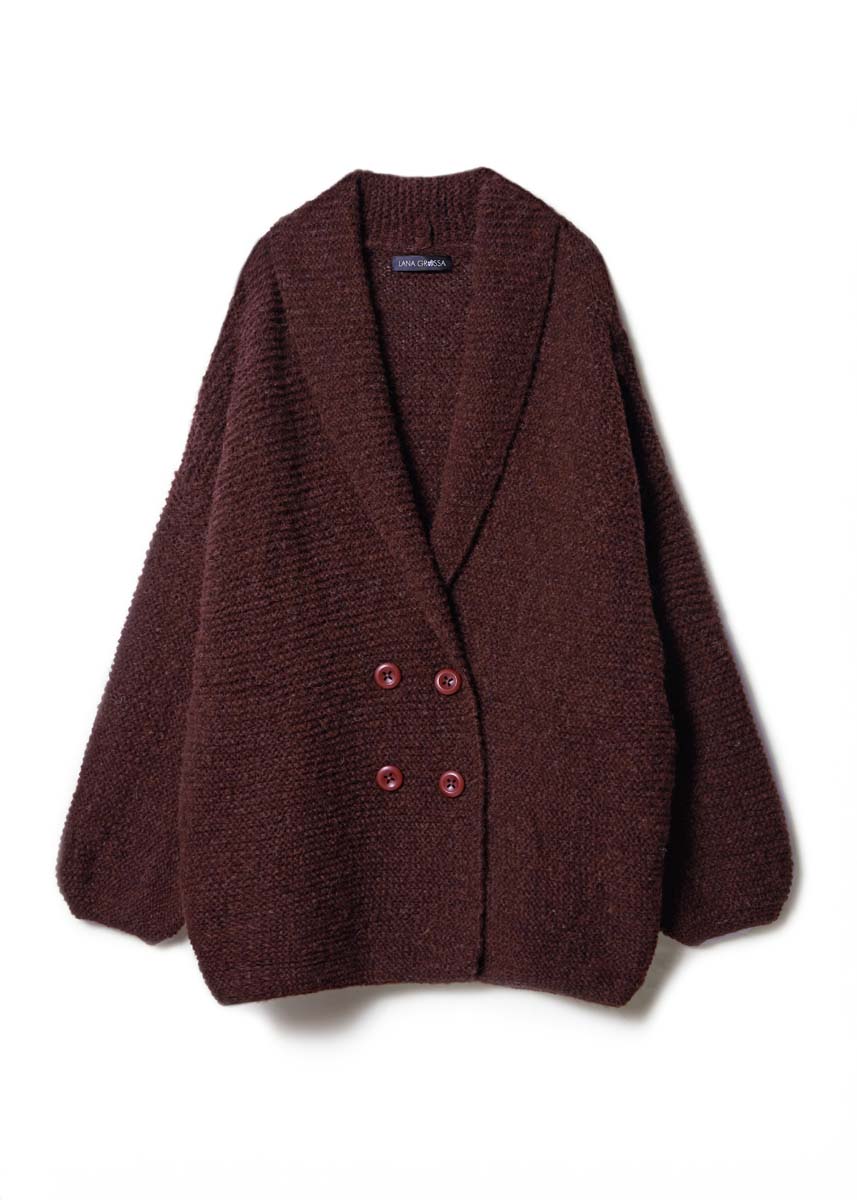 Lana Grossa-Qualität „Airy” (42 % (Baby) Alpaka, 40 % Baumwolle, 18 % Schurwolle (Merino extrafine), LL = ca. 170 m/50 g): ca. 450 (500) g Mokka (Fb. 9); Stricknadeln Nr. 5 und 5,5, 1 Rundstricknadel Nr. 5,5, 40 cm lang, Spielstricknadeln Nr. 4,5; 4 braune Knöpfe, ø 28 mm.