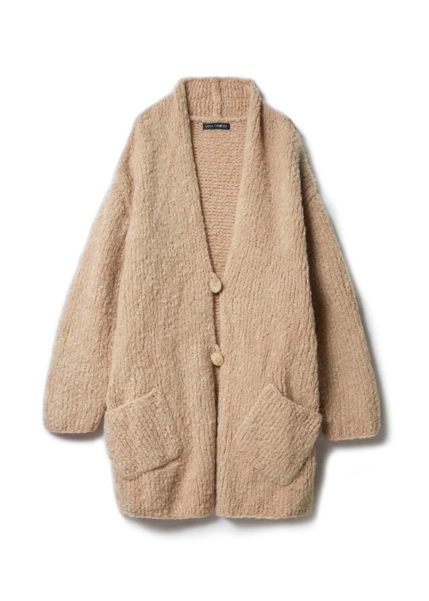 Lana Grossa-Qualität „Royal Alpaca” (93 % Alpaka (Royal), 7 % Polyamid, LL = ca. 95 m/50 g): ca. 450 (500 – 550) g Beige (Fb. 11); Stricknadeln Nr. 7 und 7,5, 1 Wollhäkelnadel Nr. 7; 2 Knöpfe in Beige, ø 35 mm.