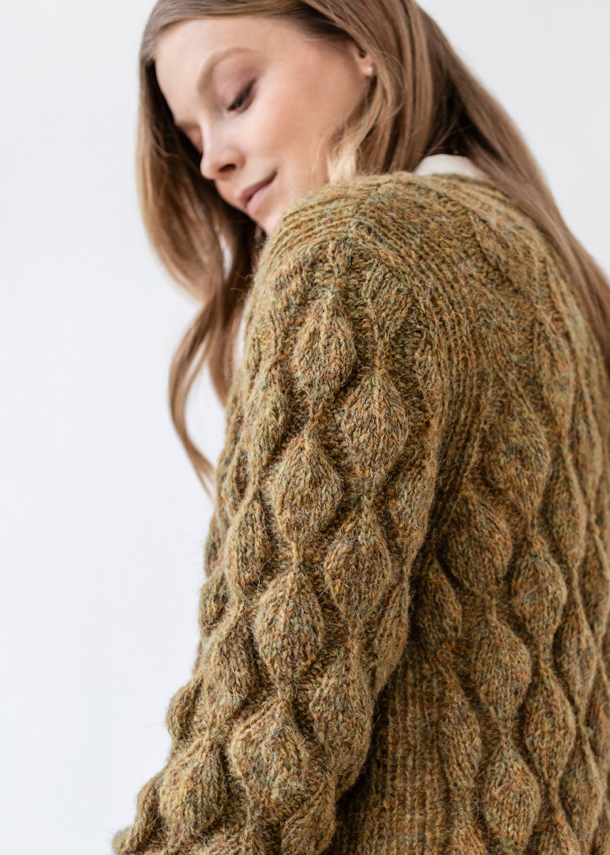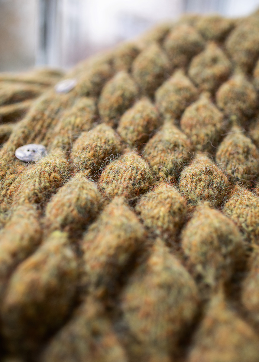 Lana Grossa-Qualität „Nuvoletta” (42 % (Baby) Alpaka, 42 % Schurwolle (Merino extrafine), 16 % Polyamid, LL = ca. 250 m/50 g): ca. 300 (350) g Senf (Fb. 11); Stricknadeln Nr. 5,5, 3 Perlmuttknöpfe von Union Knopf, Art. 452684, Fb. 14 beige/ braun, ø 23 mm.