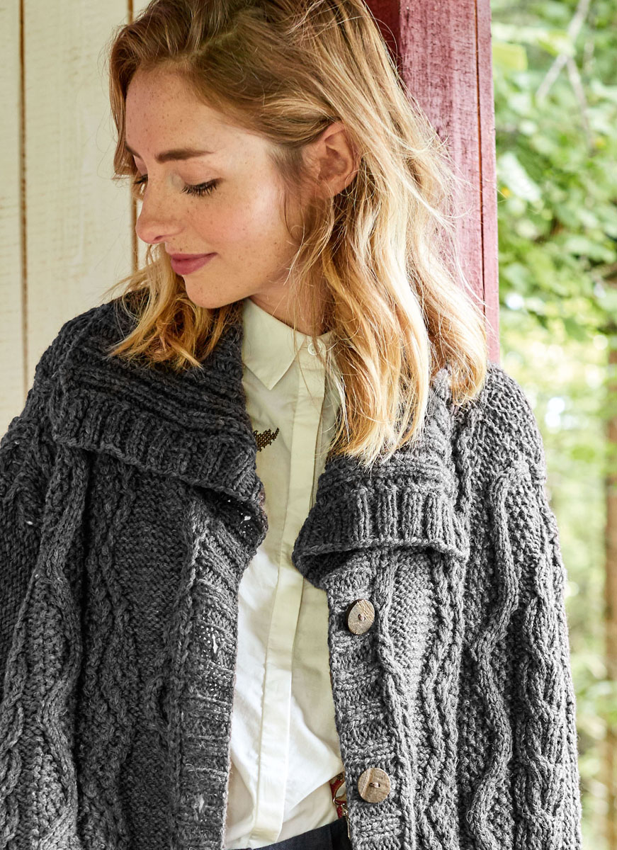 Lana Grossa Qualität „Landlust Merino 120“ (100 % Schurwolle (Merino superwash), LL = ca. 120 m/50 g): ca. 750 (800) g Hellgrau (Fb. 118); je 1 Rundstricknadel Nr. 7 und 8, 80 und 100 cm lang, 1 Zopfnadel, 1 Wollhäkelnadel Nr. 5,5; 9 Hornknöpfe von Union Knopf, Art. 44840, 25 mm ø, Fb. 20 dunkelbraun.