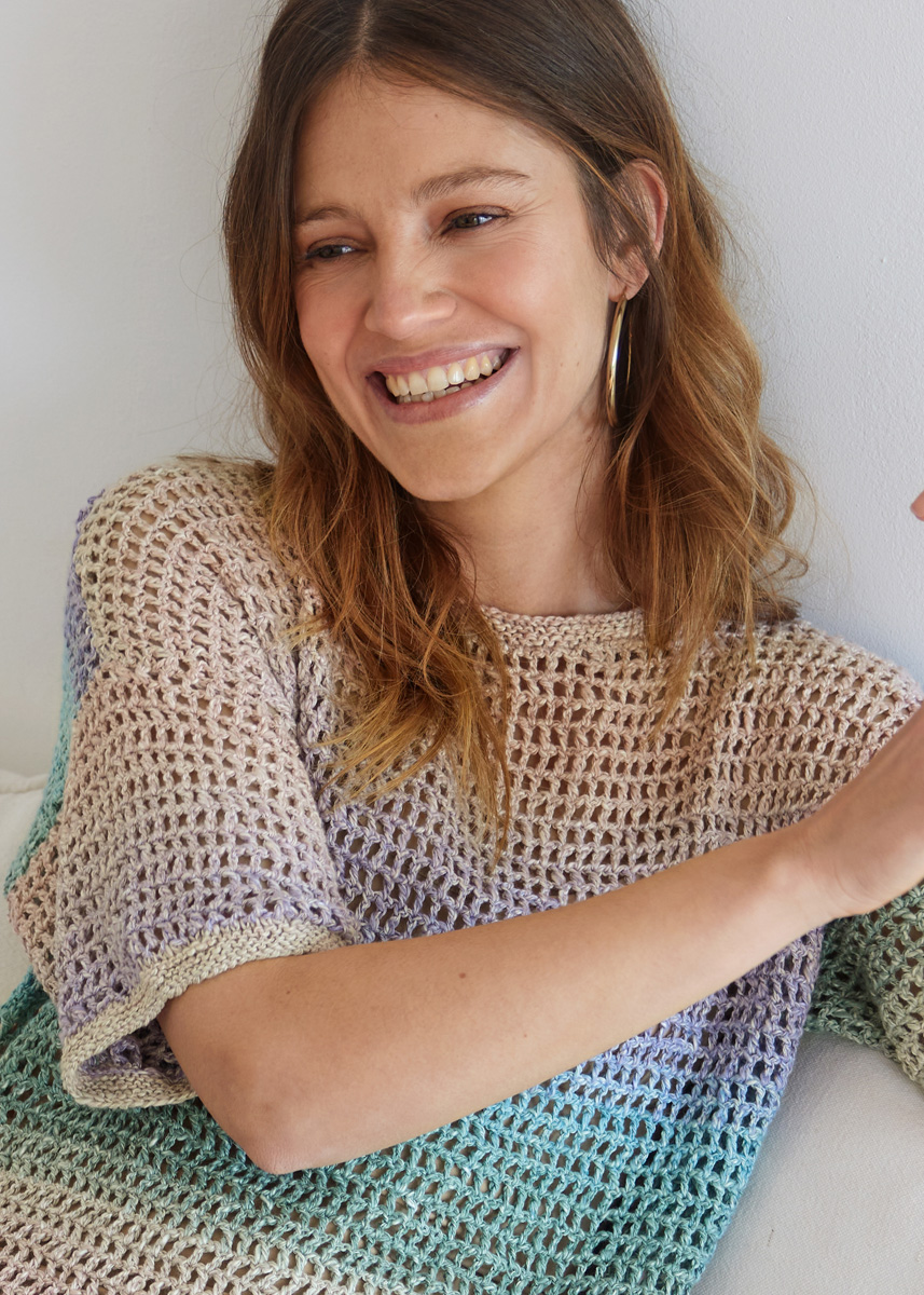 Lana Grossa-Qualität „Gomitolo Collina“ (72 % Baumwolle, 28 % Viskose, LL = ca 260 m/100 g): 4 (4 - 5 - 5) Knäuel = ca 400 (400 - 500 - 500) g Rosenholz/Lila/Hellblau/ Mint/Grège (Fb 1012); Häkelnadel Nr 3,5; 1 kurze und 1 etwas längere Rundstricknadel Nr 3,5.