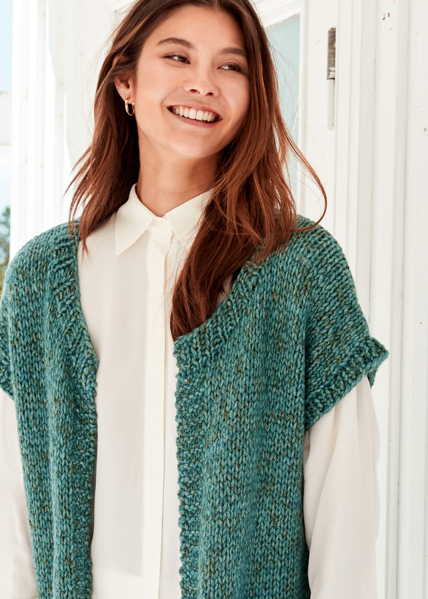 Mini-Aufand, Maxi-Effekt: Die Longweste aus voluminösem Baumwollmix brilliert mit Highlights aus farbigem Lurex. Ihre gerade Form ist hübsch kombifreudig und strickt sich schnell und unkompliziert.