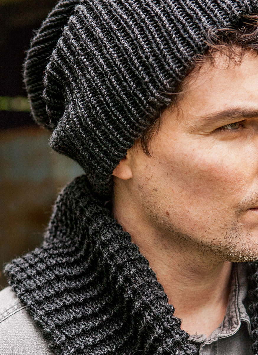 Lana Grossa-Qualität „Cool Wool Big” (100 % Schurwolle (Merino extrafine, filzfrei), LL = ca. 120 m/50 g): ca. 150 g Anthrazit (Fb. 618); Stricknadeln Nr. 4,5