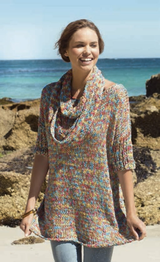 Für Alle, die es unkompliziert mögen! Dank des buntbedruckten Bändchengarns und dem lockeren Schnitt sorgen Stricktunika und Loop auch in der City für ein beschwingtes Urlaubsgefühl. ( 150 cm Umfang, 17 cm breit)