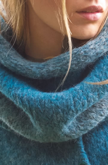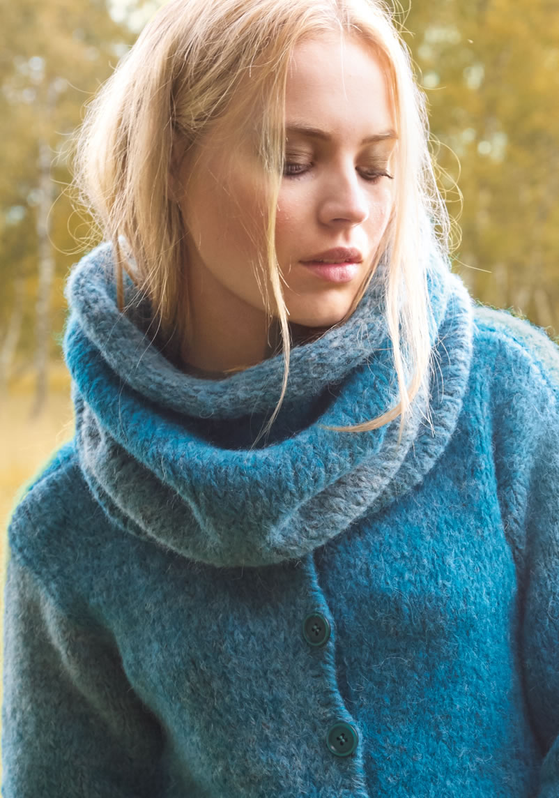 Lana Grossa-Qualität „Garzato Fleece Degradè” (70 % (Baby) Alpaka, 30 % Polyamid, LL = ca. 225 m/50 g): ca. 150 g Hell-/Mittel-/Dunkelpetrol (Fb. 301); 1 Rundstricknadel Nr. 9, 60 cm lang.