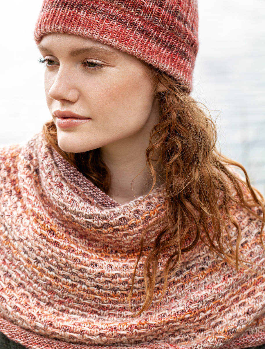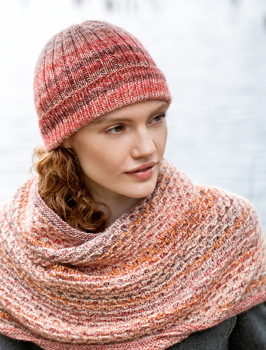Lana Grossa Gomitolo Duo 250 (45% Schurwolle Merino, 30% Bambus, 25% Polyamid, Lauflänge 250 m/100 g), 200 g Pastell-/Altrosa/ Rot/Weinrot/Burgund/Graubraun (Fb 904) und Lana Grossa Gomitolo Duo 400 (45% Schurwolle Merino, 30% Bambus, 25% Polyamid, Lauflänge 400 m/100 g), 100 g Natur/Pfirsich/Lachs/ Orange/Taupe (Fb 803); je 1 Rundstricknadel Nr. 3,5 und 4,5, 80 cm lang.
