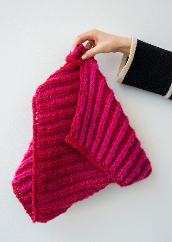 2 x je 100 g Ecopuno Chunky von Lana Grossa in 2 unterschiedlichen Farben, z.B. in Farbe 117 Pink und 118 Weinrot. Das flauschige und voluminöse Garn ist aus 48 % Baumwolle, 33 % Schurwolle und 19 % Alpaka zusammengesetzt und hat eine Lauflänge von etwa 70 m je 50 g; Rundstricknadel Stärke 7 - 8 mm, 1-2 Nadelspielnadeln in Stärke 7 - 8 mm für den Kordelrand, Sofern vorhanden eine Rundstricknadel in Stärke 10 mm für die Anschlagkante