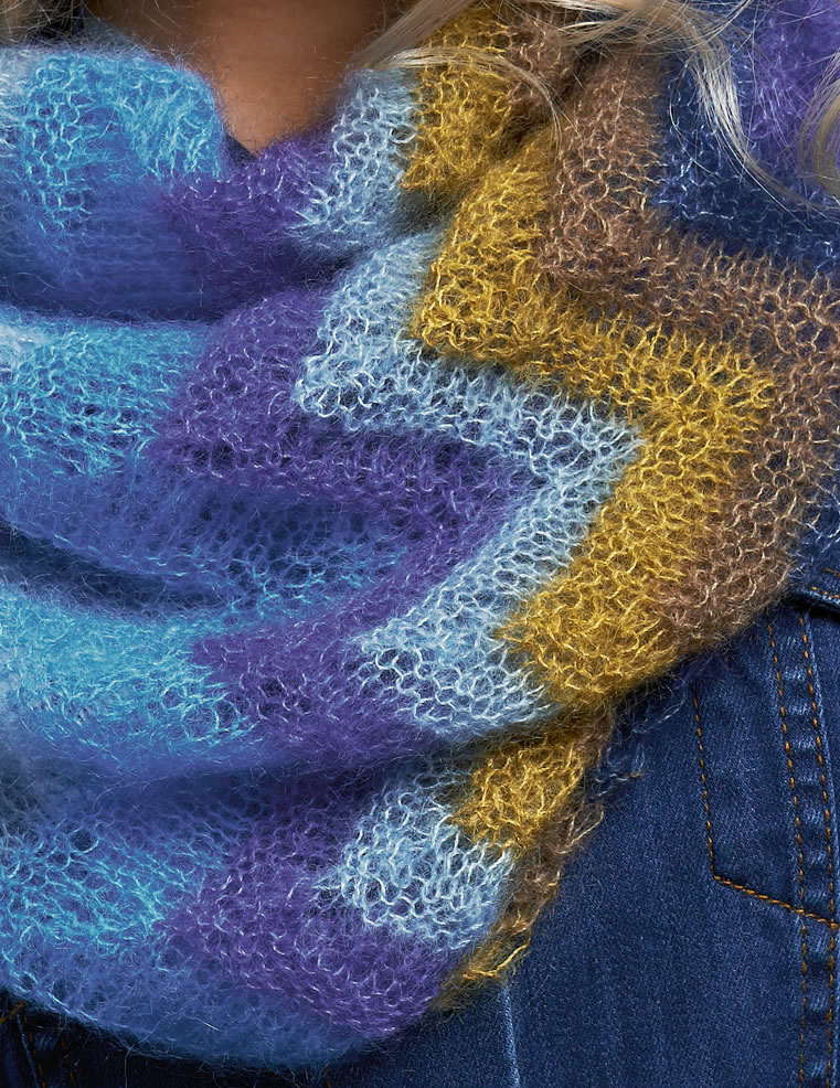 Lana Grossa-Qualität „Silkhair“ (70 % Mohair (Superkid), 30 % Seide, Lauflänge ca. 210 m/25 g): je ca. 25 g Blauviolett (Fb. 63), Hellblau (Fb. 42), Senf (Fb. 72), Hellbraun (Fb. 24), Dunkelblau (Fb. 79) und Kornblume (Fb. 40); Stricknadeln Nr. 4