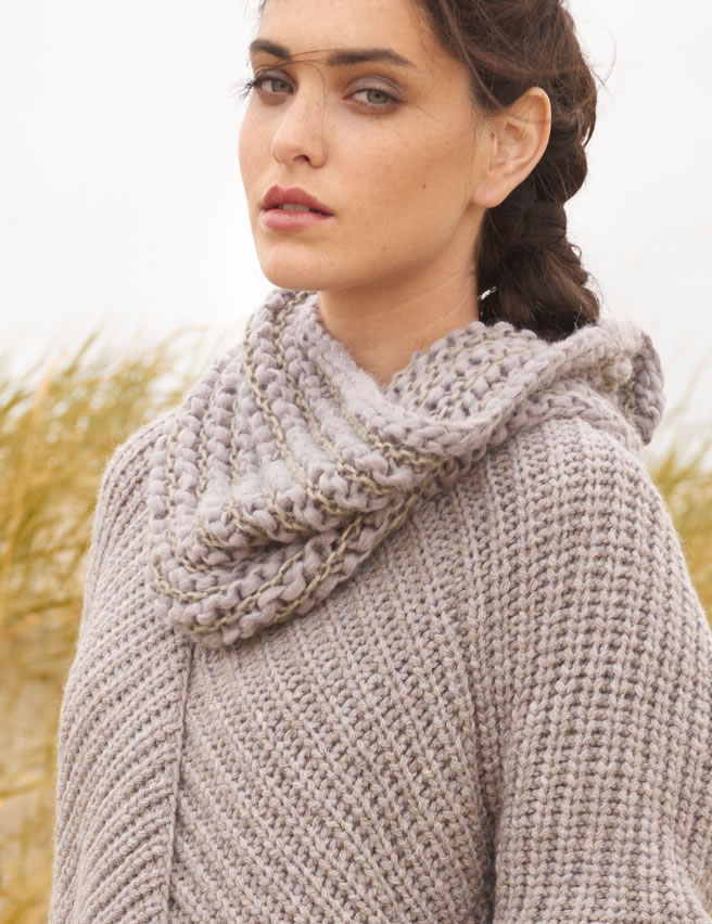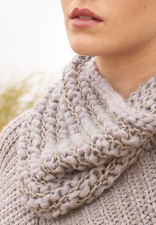 Lana Grossa-Qualität „Ambiente” (70 % Schurwolle (Merino extrafine), 30 % (Baby) Alpaka, LL = ca. 80 m/50 g): ca. 100 g Fliedergrau (Fb. 11) und Lana Grossa-Qualität „Arioso” (48 % Schurwolle (Merino extrafine), 30 % (Baby) Alpaka, 22 % Polyamid, LL = ca. 240 m/50 g): ca. 50 g Grau (Fb. 11); 1 Rundstricknadel Nr. 12, 80 cm lang.