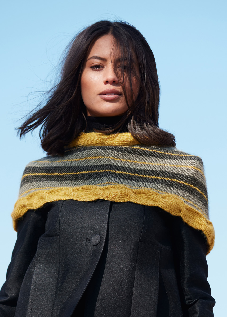 Lana Grossa Lace Seta Mulberry (35% Seide (Maulbeer), 35% (Baby) Alpaca, 30% Schurwolle (Merino extrafein), Lauflänge 175 m/50 g), 100 g Gelb (Fb 10), 100 g Dunkelgrau (Fb 15) und 100 g Graugrün (Fb 13); 1 Rundstricknadel Nr. 3,5, 80 cm lang, Stricknadeln Nr. 3,5 und 1 Zopfnadel.