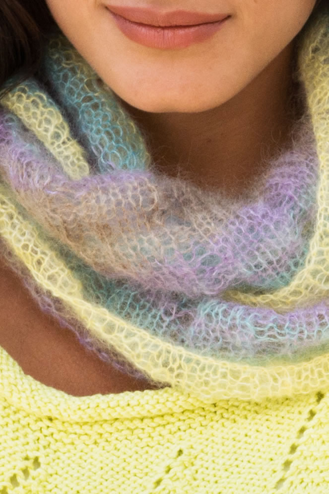 Lana Grossa-Qualität "Silkhair Print" (70 % Mohair (Superkid), 30 % Seide, LL = ca. 420 m/50 g): ca. 50 g Lila/Taupe/ Gelb/Türkisgrün (Fb. 310); 1 Rundstricknadel Nr. 5,5, 120 cm lang.