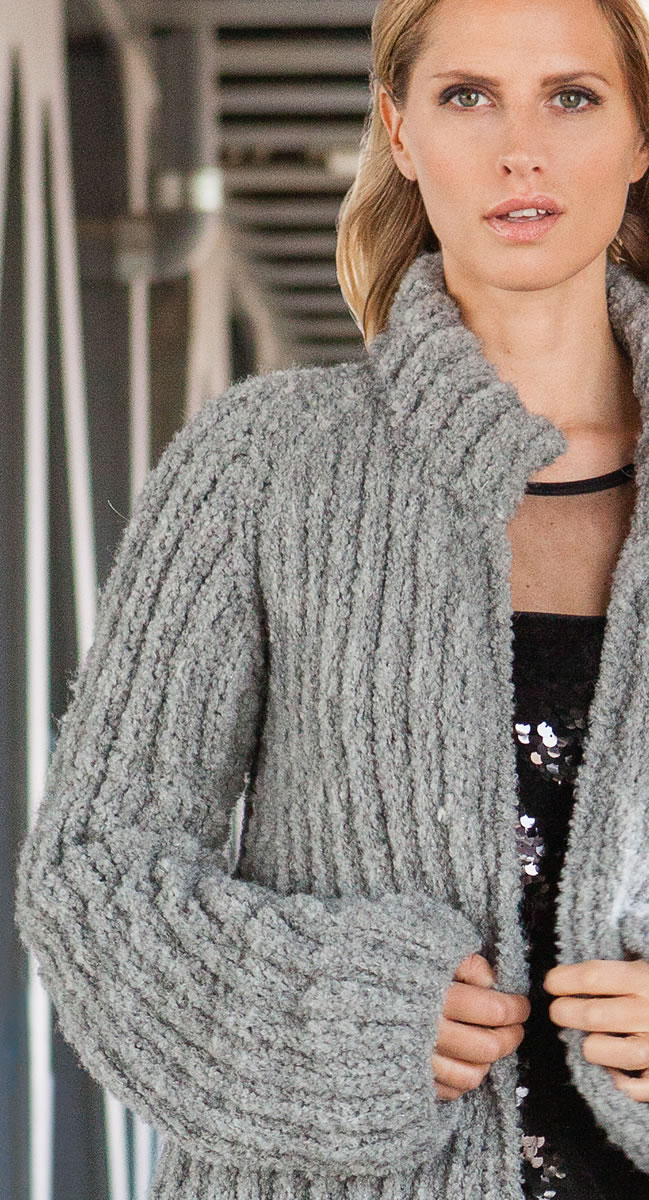 Glitzerndes Bouclé- Garn, Trompetenärmel, eine leichte A-Silhouette und das Ganze lässig gerippt – fertig ist die sportlichelegante Mantel-Variante!