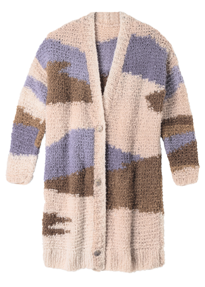 Lana Grossa Lala Berlin Cloudy (93% Schurwolle (Merino extrafine), 7% Nylon, Lauflänge 100 m/50 g), 250 (300 – 350) g Beige (Fb 1), 150 (200 – 200) g Nougat (Fb 2) und 100 (150 – 150) g Graulila (Fb 5); Stricknadeln Nr. 7 und 8, sowie 1 Rundstricknadel Nr. 7, 120 cm lang und 3 Perlmuttknöpfe von UNION KNOPF, Ø 28 mm.
