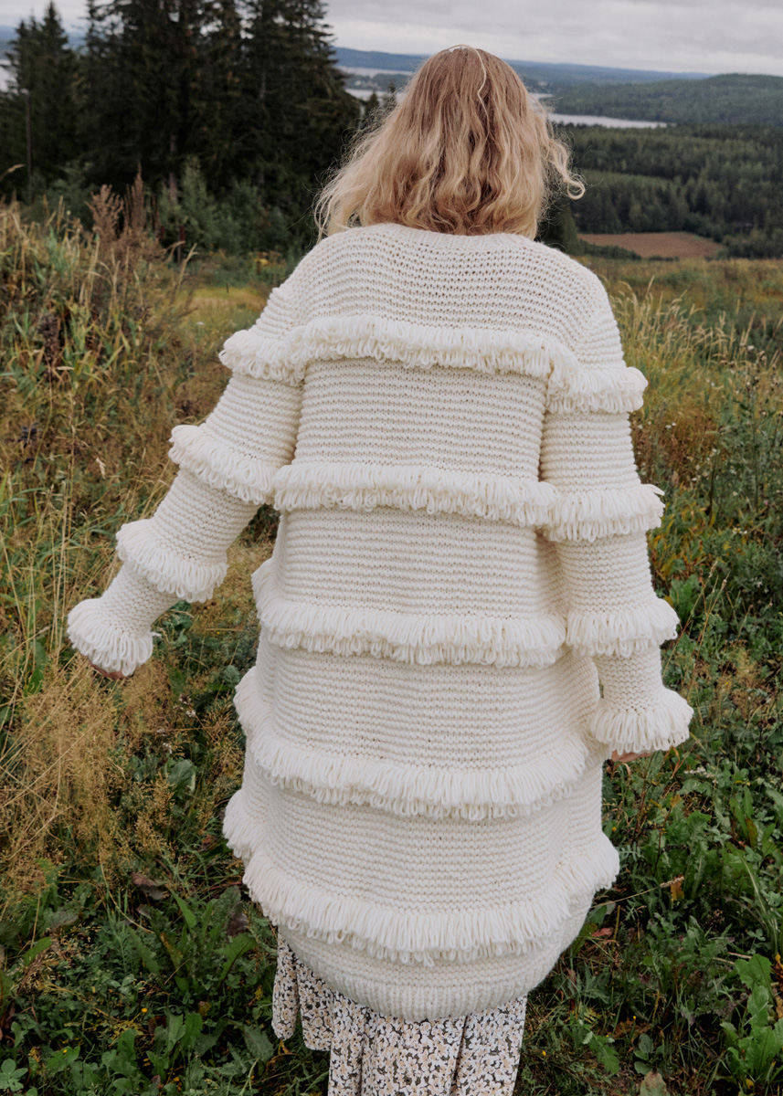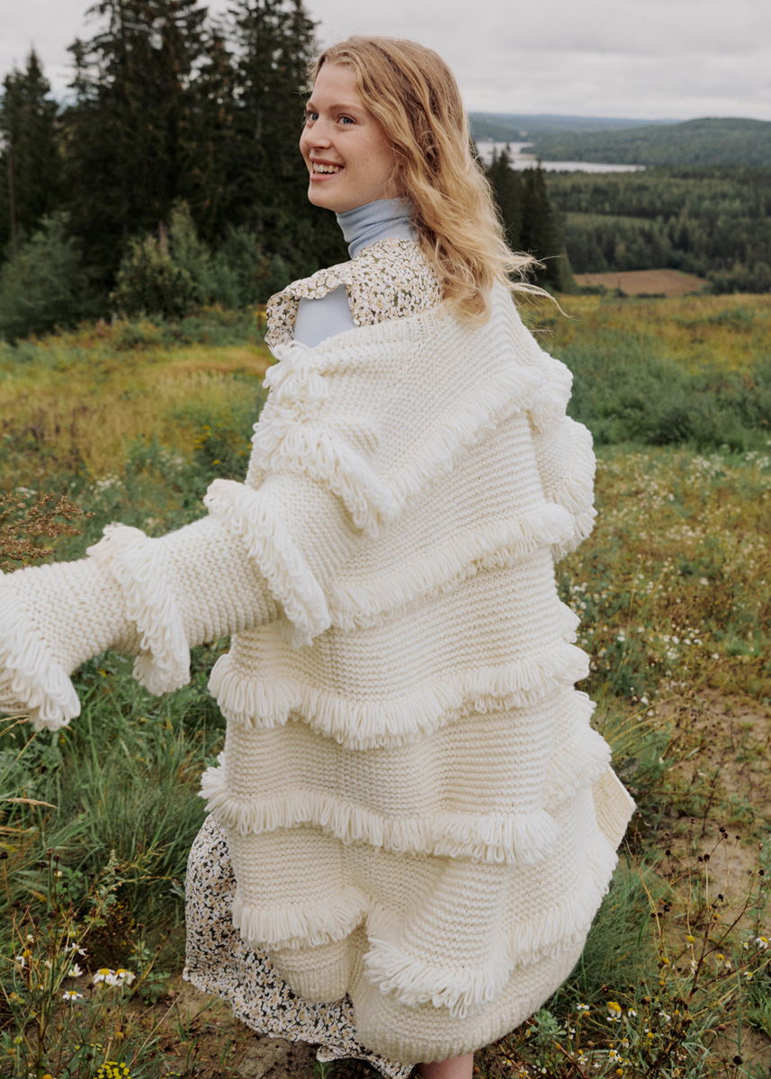 Lana Grossa-Qualität „Cool Merino“ (90 % Schurwolle (Merino), 10 % Polyamid, Lauflänge 150 m/50 g): ca. 1250 (1300) g Weiß (Fb. 15); Stricknadeln Nr. 9 und 10, 1 Rundstricknadel Nr. 9, 120 cm lang, je 1 Rundstricknadel Nr. 9 und 10, 80 cm lang; ca. 5 x 5 cm sehr feste Pappe zum Einstricken der Schlingenfransen.